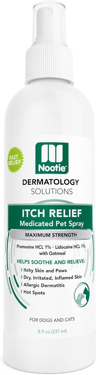 Made with 1% Pramoxine HCL and 1% Lidocaine HCL, this gently formulated medicated pet spray offers instant relief for your four-legged friend. Oatmeal extract helps to rejuvenate and soothe your dog or cat’s skin at the same time. Nootie Medicated Anti-Itch Spray for Pets is perfect for targeting those hard to reach areas like paws and in between toes, providing relief and allowing the skin to heal. The spray can be used to relieve symptoms of hot spot, allergic dermatitis, and dry, inflamed skin.Specifications