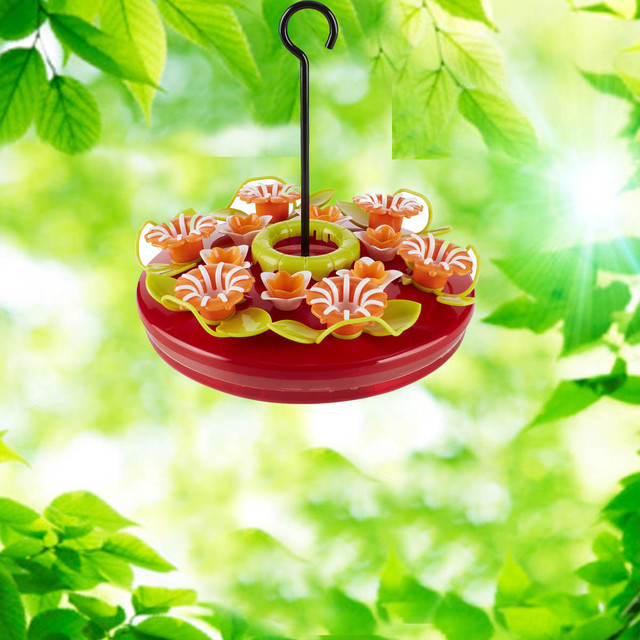 12 brightly-colored feeding ports; 2-way mount - hang or pole mount; Built-in ant moat protects nectar from ants