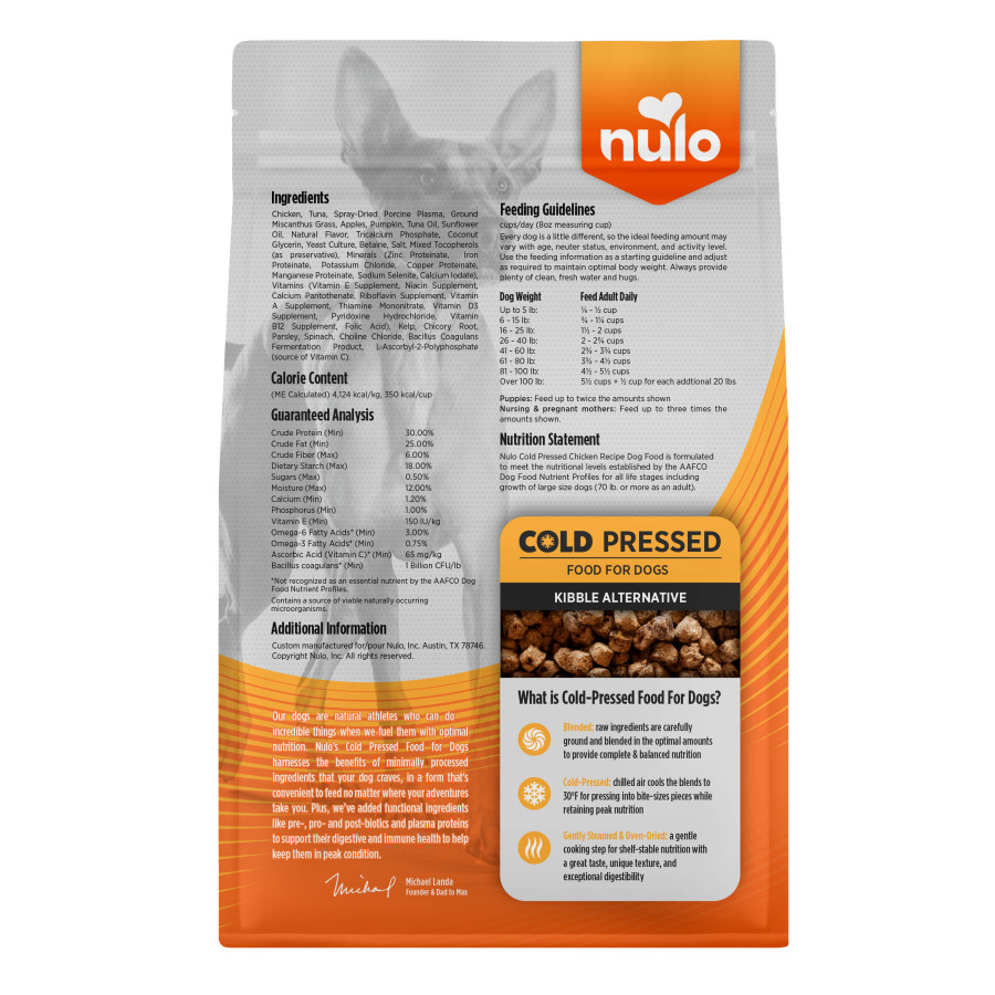 Nulo's Cold Pressed Food for dogs harnesses the benefits of minimally processed ingredients that dogs crave, in a form that's convenient to feed no matter where your adventure leads. An innovative kibble alternative, Nulo Cold Pressed is made of 95% animal-based protein and uses no meat meals for superior protein absorption. This is the perfect solution for those looking for a reduced carbohydrate diet for their dogs, plus it is made with pre, pro and post-biotics for exceptional digestive and immune system support.Specifications