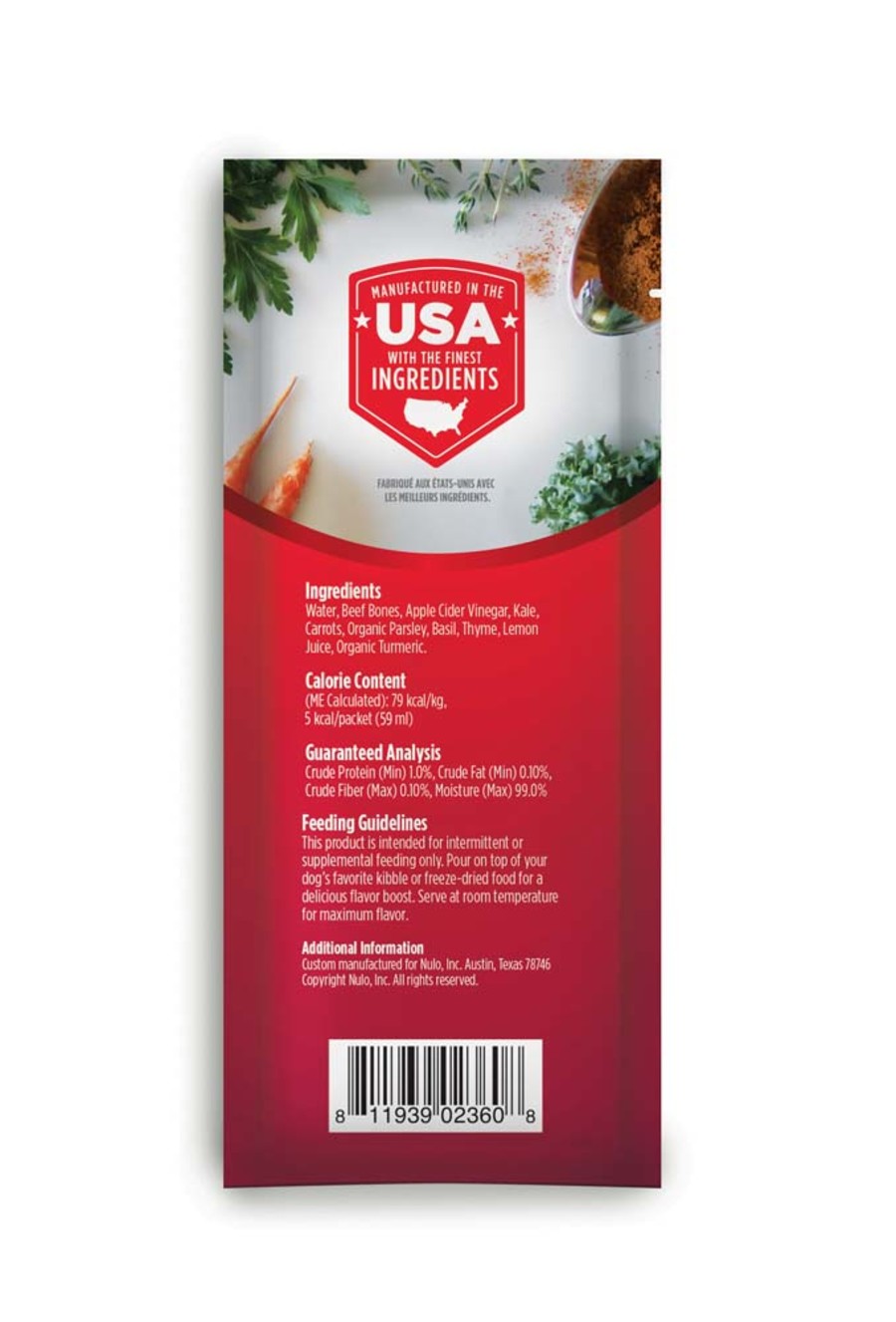 A wholesome bone broth can transform an ordinary meal into a culinary experience. We’ve slowly simmered the bones of 100% human-grade grass-fed beef for up to 48 hours to extract nourishing protein, and gently infused them with ingredients like basil, thyme, and turmeric for a savory and comforting flavor.Simply pour over your dog or cat’s next kibble or freeze-dried meal, and watch them enjoy the satisfying difference a little bone broth can make.Specifications