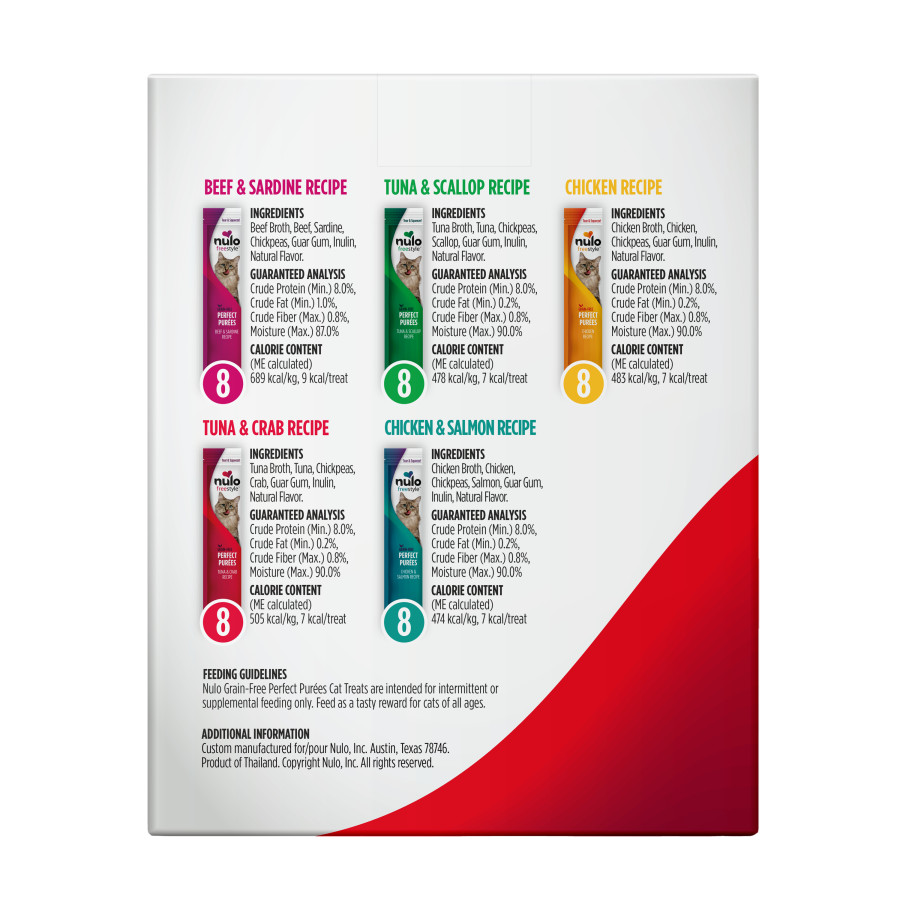 When nutrition meets love, the result is simply purrr-fect. Nulo FreeStyle Perfect Puree is a tasty way to show your tiny tiger how special they are to you while delivering a highly nutritious reward! Serve directly from the packet as a lickable treat or use as a topper to kibble or canned food! Nulo's Perfect Purees are a treat for pet parents to feed and for cats of all ages to eat! Nulo FreeStyle offers a wide range of dry, wet, freeze-dried raw, treat, and topper recipes to fuel your cat’s adventures. On average, 83-90% of the protein in our FreeStyle diets for cats comes from animal sources, which provides your cat with the ideal amino acid profile! FreeStyle’s formulas are grain-free, using ingredients like sweet potatoes and chickpeas as low-glycemic, whole-food carbohydrate sources.Specifications