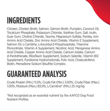 Dogs require plenty of protein and moisture to stay active and healthy throughout their lives. Our stews are inspired by what dogs love with tender morsels of chicken and salmon plus essential nutrients to help them thrive.Specifications