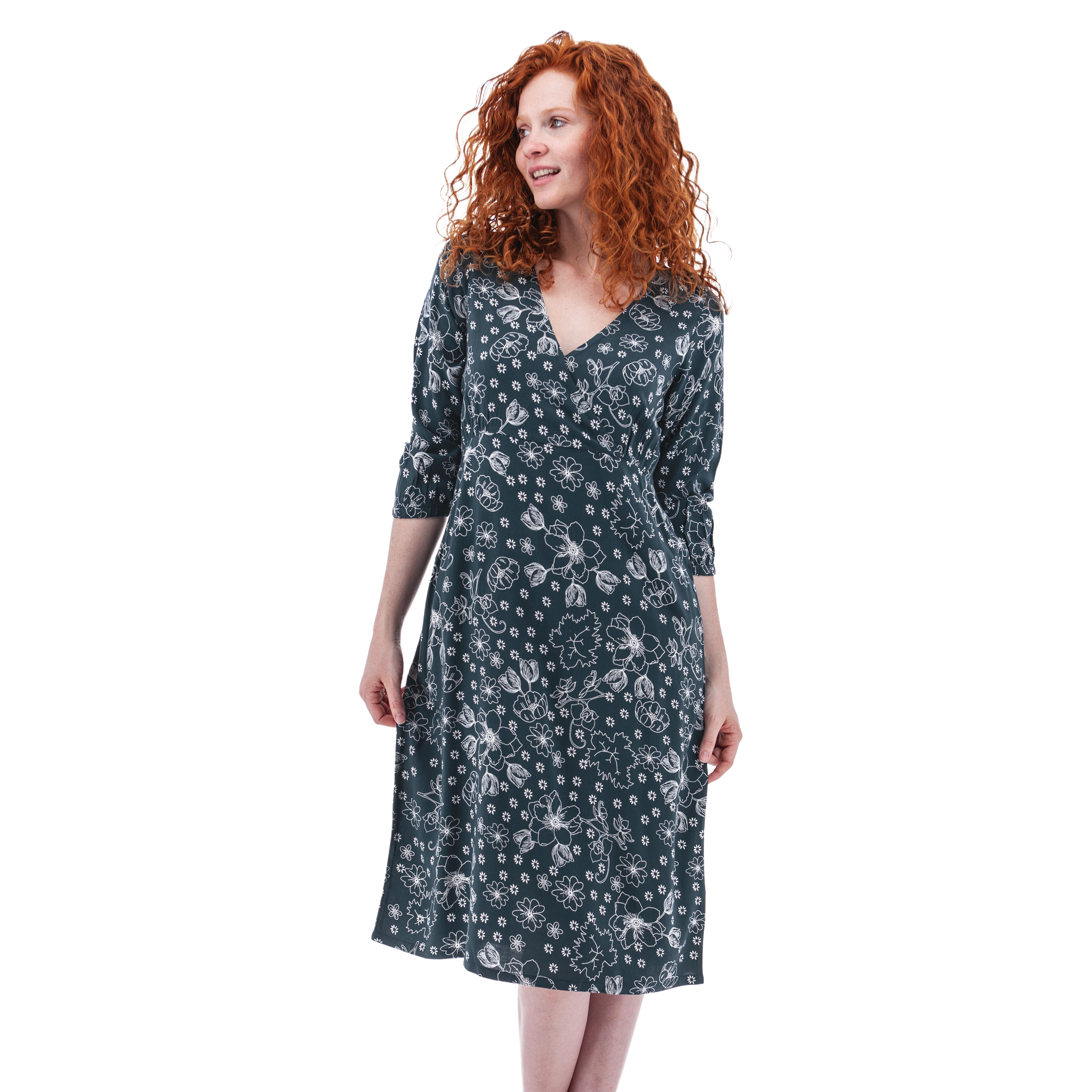 3/4 LENGTH SLEEVES; ALL OVER PRINT; ELASTIC CUFFS; FIXED SURPLICE BODICE; HIP POCKETS; MIDI LENGTH