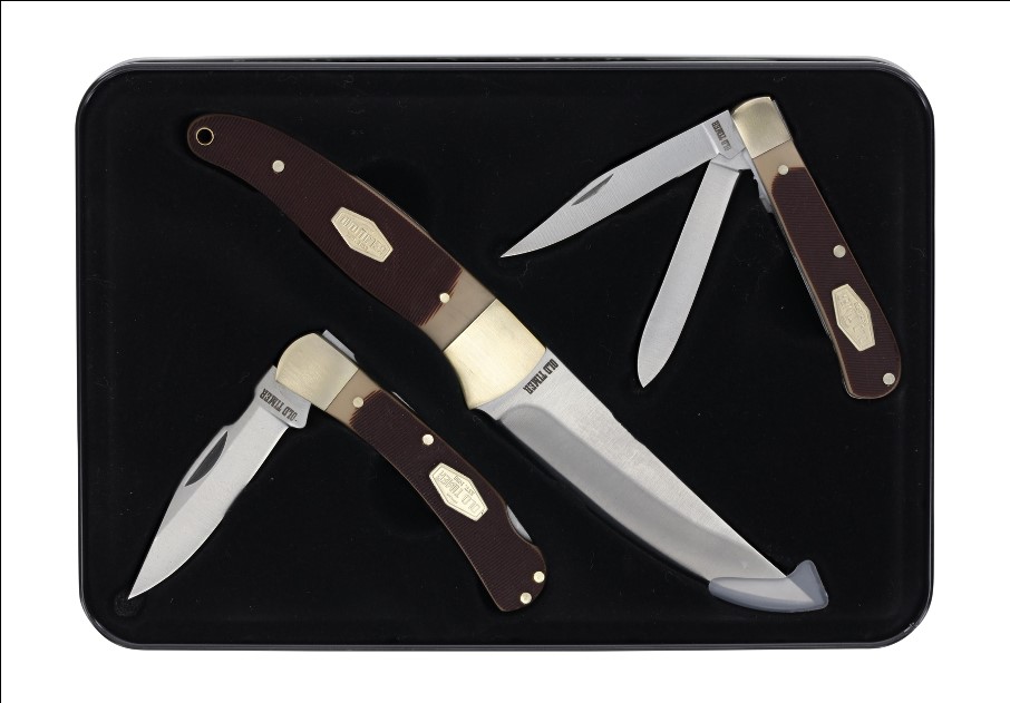 OLD TIMER 3PC KNIFE COMBO SET IS A GREAT GIFT FOR THE KNIFE ENTHUSIAST. COMBO SET COMES WITH A FULL TANG FIXED BLADE AND SHEATH, 2-BLADE TRAPPER FOLDING KNIFE, AND A SINGLE BLADE LOCKBACK STYLE POCKET KNIFE. ALL PACKAGED IN A COLLECTORS TINSpecifications