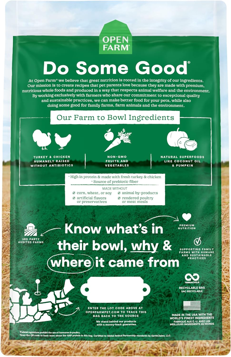 100% TRACEABLE INGREDIENTS FROM CERTIFIED FAMILY FARMS; A BLEND OF ANCIENT GRAINS LIKE MILLET, QUINOA, SORGHUM & CHIA SEEDS; ANTIBIOTICS, HORMONE, & STEROID FREE; HUMANELY RAISED, FREE-TO-ROAM TURKEY; NUTRIENT-DENSE DRY KIBBLE; SCOOP & POUR FOR A COMPLETE MEAL