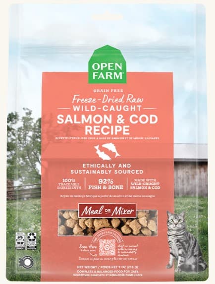 100% TRACEABLE INGREDIENTS; ALWAYS 100 % NON-GMO; GENTLY FREESE-DRIED, NEVER COOKED, EASY TO FEED PURE RAW NUTITION; GRAIN FREE; HIGH PROTEIN; LEGUME FREE; MADE WITH ETHICALLY SUSTAINABLY SOURCED CAUGHT WILD SALMON AND PACIFIC OCEAN CAUGH COD; ORGANIC FRUITS AND VEGETABLES