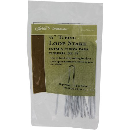Orbit 1/4" galvanized metal loop drip stakes are used to hold 1/4 In. distribution and soaker tubing in place. These drip irrigation stakes work with all dripper irrigation systems for do-it-yourselfers and garden and lawn professionals alike. Whether you are customizing an existing irrigation drip system or creating a new drip watering system, this 10-pack of drip irrigation tubing stakes is just what you need.Specifications