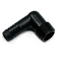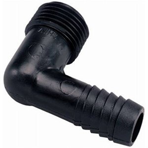 90 degree elbow adapter; For outdoor use with cold water only.; For use with 1/2" riser flex pipe; Made of molded high-impact plastic; Size: 1/2" MNPT x 1/2" Barb; Spiral barbs hand-fasten to the pipe eliminating the need for glue and clamps