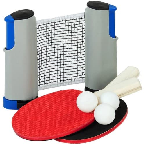 10.25 x 6.25 x 4 in carry bag; Authentic full size table tennis paddles.; Expands up to 6 ft and fits most tables up to 1.75 inches thick.; Play indoors or out!; Players: 2; Set includes: expandable net 2 x full size wood paddles 3 x ping pong balls instructions and carry bag.; Weight 1.5lbs.