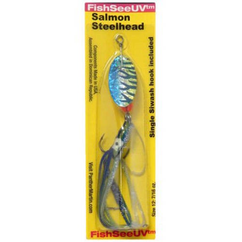 Easy to replace split ring hook attachment system; Hammered blade effect reflects in the water and attract fish due to the increased surface area; Hoochie skirts move through water pretty much like squids move through waves and are deadly meal to all salmon steelhead muskie and pike; Loud sonic vibrations send salmon and steelhead into a feeding frenzy; Outfitted with a true to life salmon egg bead; Premium UV painted finish to maximize visibility; Salmon steelhead pike muskie and other species of fish use the UV spectrum to recognize baitfish and other natural prey