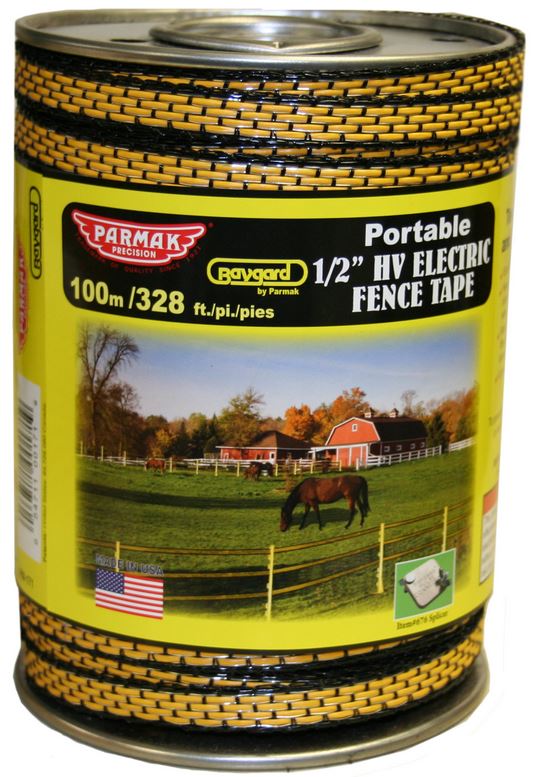 Parmak HV 1/2" Equi-Tape - 328' has PVC coated fiberglass to provide it with high strength and low stretch and sag characteristics. Compared to stainless steel, it is 50x more conductive (low resistance) with high-conductivity aluminum wire conductors. Parmak’s Baygard HV tape is lightweight at only 4.5 lb. (2 kg) per 1/4 mile. HV tape is easy to re-roll and reuse and will not kink.Specifications
