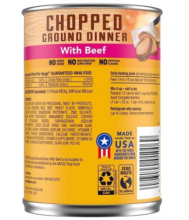 PEDIGREE CHOPPED GROUND DINNER soft, wet dog food with beef gives your dog the flavors they crave with the nutrition they need. Your adult dog can enjoy the delicious taste of real beef in every bite with our hearty wet dog food. PEDIGREE formulas provide the perfect balance of vitamins and minerals with no artificial flavor, no added sugar, and no high fructose corn syrup. Each recipe is balanced for adult dogs, so you know they are getting the most from their wet dog food. You can serve this dog food as a topper, mixer or on its own. Any way you serve it up, PEDIGREE canned dog food can help your dog grow happy and healthy.Specifications
