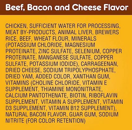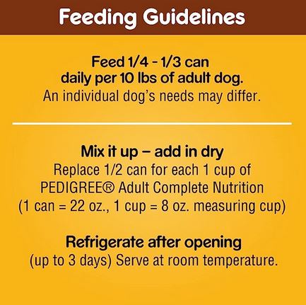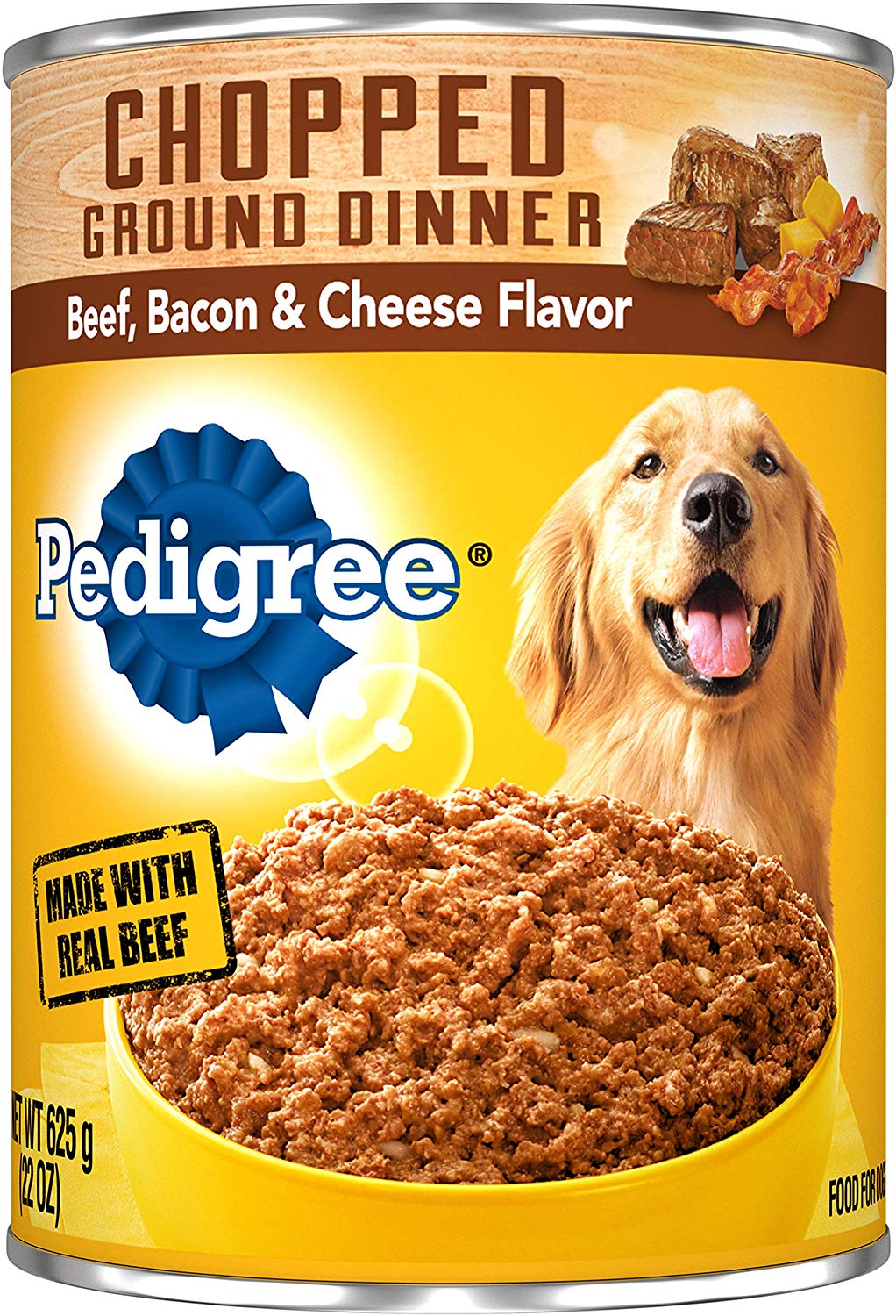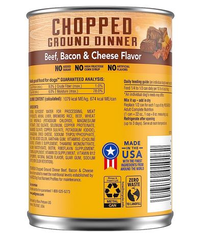 PEDIGREE CHOPPED GROUND DINNER beef, bacon & cheese flavored soft, wet dog food gives your dog the flavors they crave with the nutrition they need. Your adult dog can enjoy the delicious taste of real beef in every bite with our hearty wet dog food. PEDIGREE formulas provide the perfect balance of vitamins and minerals with no artificial flavor, no added sugar, and no high fructose corn syrup. Each recipe is balanced for adult dogs, so you know they are getting the most from their wet dog food. You can serve this dog food as a topper, mixer or on its own. Any way you serve it up, PEDIGREE canned dog food can help your dog grow happy and healthy.Specifications