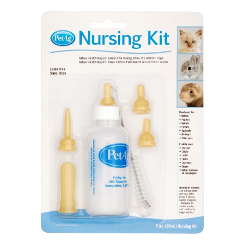 PetAg Complete Nursing Kit contains all the equipment you need to feed newborn animals including a bottle several nipples of varying shapes and a cleaning brush.Specifications