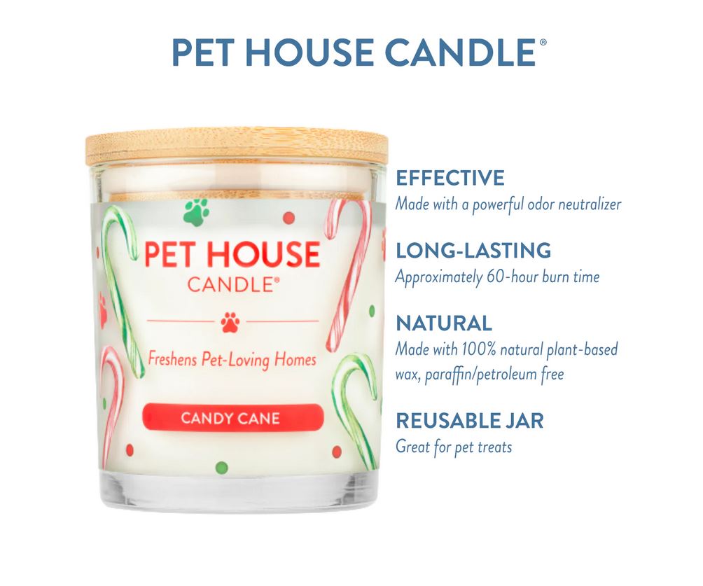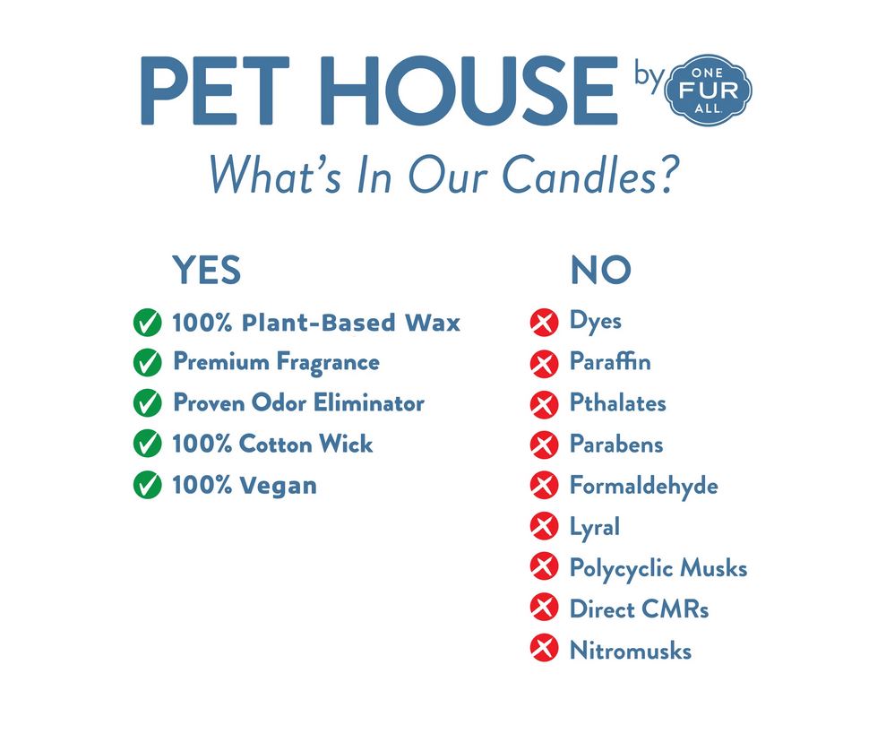 100% COTTON WICK; 100% NATURAL SOY WAX; CONTAINS NO PARAFFIN/PETROLEUM BY-PRODUCTS; HAND-POURED IN THE USA; PREMIUM, NON-TOXIC FRAGRANCES; REUSABLE JAR; SPECIALLY FORMULATED TO FRESHEN PET-LOVING HOMES; TESTED & PROVEN TO ELIMINATE 99% OF PET ODORS; UP TO 60 HOURS OF BURN TIME