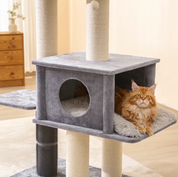 Introducing PetPals' Extraordinary Lulu Extra Large Cat Tree, perfect for large breeds and multi-cat homes. Features include an extra-large rubber groomer for soothing grooming sessions, a spacious condo with a removable premium shag fur cushion for comfort, and natural sisal scratching posts to promote healthy habits. Crafted from high-quality shag fur material, it offers a soft, inviting space for relaxation. An elevated plush perch provides a secure vantage point for your cat's viewing pleasure! The extra-large massager helps maintain your cat's coat health and the large sisal scratching posts help redirect healthy scratching instincts. Treat your cat to the ultimate blend of comfort and wellness with the PetPals Lulu Cat Tree!Specifications