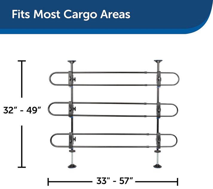 "Help keep your pets where they’re safe and comfortable with the PetSafe Solvit Tubular Car Pet Barrier. This adjustable pet barrier expands from 32-49 in. high and 33- 57 in. wide. The tubular barrier fits most vehicle types, including smaller SUVs and Crossovers. Special features help reduce or eliminate rattling sounds so you can enjoy a truly peaceful ride. The rubberized top and bottom caps firmly grip the floor and headliner to prevent slipping and don’t fall off when the barrier is disassembled. Quick-connect clamps allow you to easily and quickly remove the three adjustable tube sections for quick access to the pet or cargo area. This feature also allows you to easily take the barrier out when more space is needed and set it up again when you and your pet are on the go. Most un-installs and re-installs take place in about a minute.Specifications