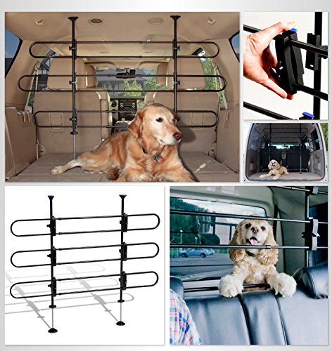EASILY ASSEMBLE THE METAL BARRIER WITH JUST YOUR HANDS; RATTLE-FREE DESIGN OF THE METAL BARRIER REDUCES NOISE ON ROAD TRIPS; SLIDE THE DOG BARRIER TO ADJUST IT TO FIT BACKSEAT OR CARGO AREAS IN YOUR CAR OR SUV; STURDY, METAL BARRIER ALLOWS YOU TO HAVE CLEAR VISIBILITY INTO THE BACK OF YOUR VEHICLE; TENSION SECURES THE BARRIER IN PLACE & RUBBERIZED CAPS KEEP IT FROM SLIPPING DURING USE; THE METAL DOG BARRIER KEEPS YOUR FURRY FRIEND FROM INVITING THEMSELVES INTO THE PASSENGER SEATS SO YOU CAN FOCUS ON THE ROAD; WHEN YOU ARE NOT USING THE BARRIER, IT QUICKLY DISASSEMBLES SO YOU CAN STORE ITI N THE INCLUDED STORAGE POUCH UNTIL YOUR NEXT ADVENTURE WITH YOUR PUP