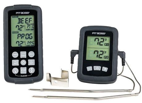 Grill with confidence with the Pit Boss Wireless Digital Meat Thermometer. Using the fully programmable meat probes, there’s no need to step away to check on your food since you can monitor it from up to 300 feet away. Simply set your desired temperature for what’s on the menu for the day and rely on the bright LCD screen to let you know when it’s ready. The thermometer also has an alarm to alert you when the desired internal temperature is reached and features a countdown timer.Specifications