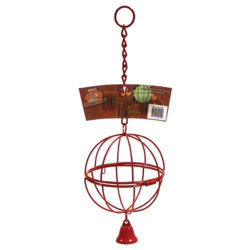 6 INCH LENGTH BY 4 INCH WIDTH BY 4 INCH HEIGHT; DURABLE METAL IS COATED WITH RUST RESISTANT RED FINISH; FILL WITH VEGGIES AND HANG IN COOP FOR SNACK TIME; FREE INCLUDED CLIP ALLOWS TREAT BALL TO BE CLIPPED TO ANY CHICKEN CAGE; INCLUDED BELL PROVIDES ENTERTAINMENT FOR CHICKENS; STIMULATES CHICKENS NATURAL FORAGING INSTINCTS BY PROVIDING A CHALLENGING FEED SOURCE