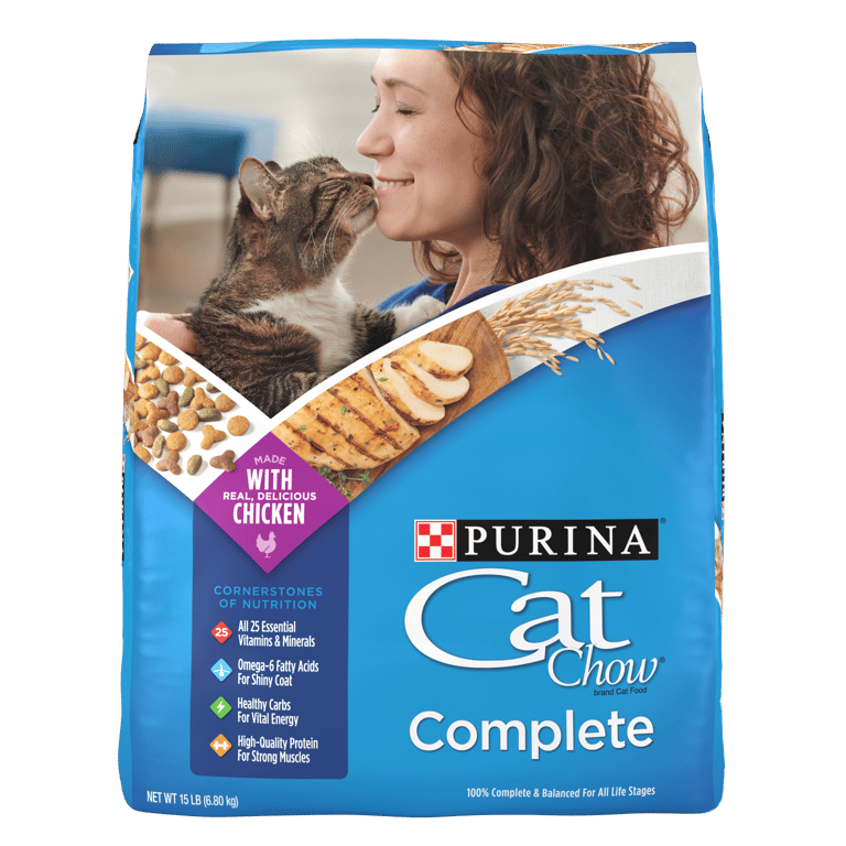 Serve Purina Cat Chow Complete dry cat food to provide your cat with the nutrition she needs to live a healthy life. This recipe is made with real and farm-raised chicken and supplies high-quality protein to support strong muscles. Plus, it has healthy carbs for vital energy and omega-6 fatty acids to help promote a shiny coat. Purina Cat Chow Complete is formulated to nourish cats at every stage of life, from kittens to adult cats, providing them with 25 essential vitamins and minerals to support overall health. Wholesome ingredients in this high protein dry cat food ensure that your cat gets a quality meal in her dish, and 100 percent complete and balanced nutrition helps to support her overall health. Give your cat the four cornerstones of nutrition at every feeding, including high-quality protein, healthy carbs, essential fatty acids, and essential vitamins and minerals. With a great-tasting recipe, this Purina Cat Chow dry cat food provides nutrition to make every moment complete.Specifications