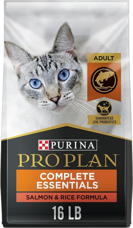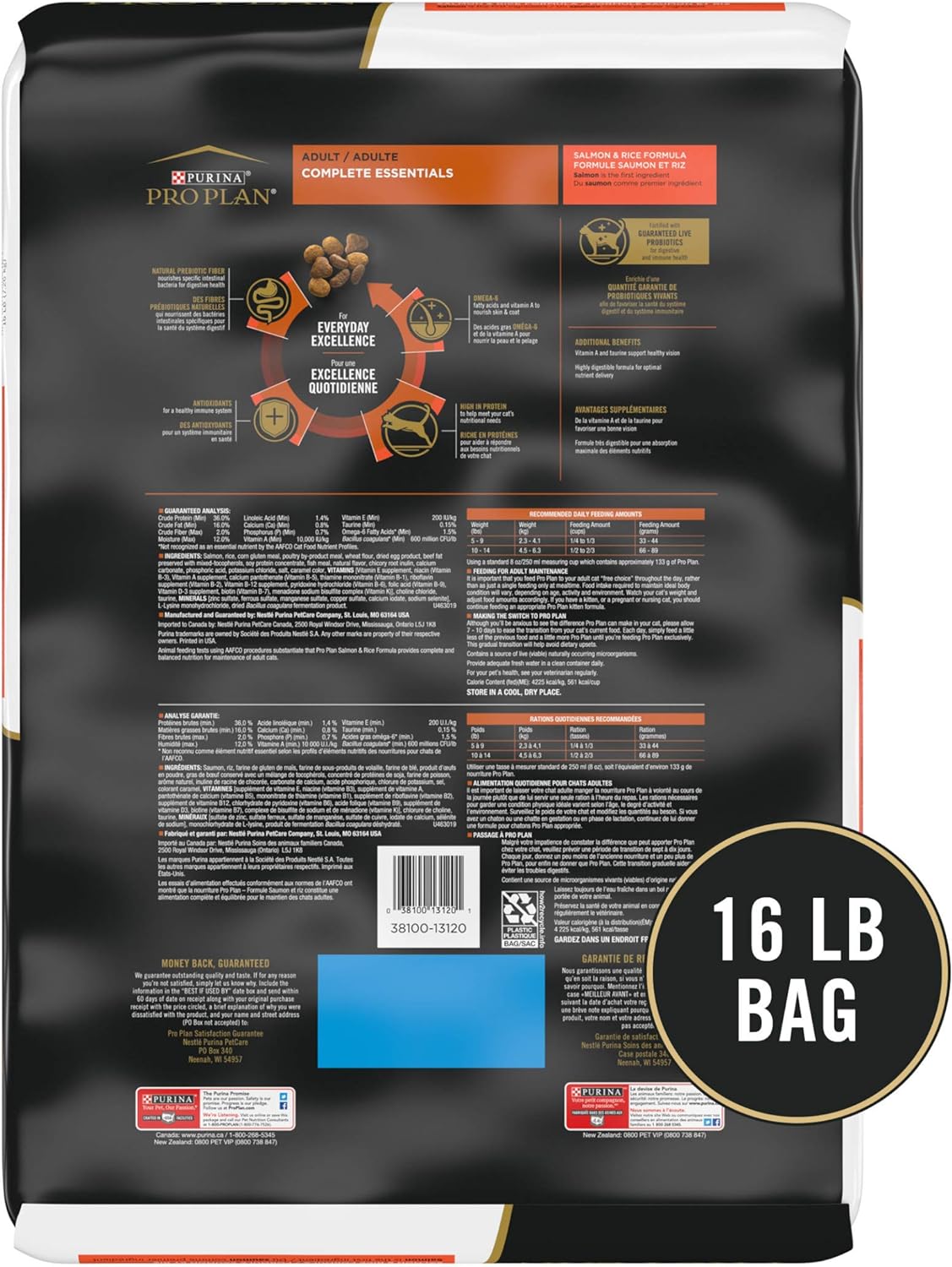 Deliver delicious goodness to your cat's dish with Purina Pro Plan COMPLETE ESSENTIALS Salmon and Rice Formula adult dry cat food. This high-protein cat food kibble features guaranteed live probiotics to promote digestive health and delivers high-quality protein, including real salmon as the first ingredient. Every high-quality ingredient in this Purina cat food is carefully chosen for a specific purpose, so you can feel confident as you fill your feline's dish. Vitamin A and linoleic acid, an omega fatty acid, help to nourish her skin and coat, while antioxidants help support her immune system health. This adult cat food also delivers 100 percent complete and balanced nutrition, so she gets the nutrients she needs to be her best every day. With a taste and texture sure to capture her attention, Purina Pro Plan COMPLETE ESSENTIALS delivers the sensory experience cats love. Giving your cat high-quality nutrition is important to you, and you can find those high-quality meals with Purina Pro Plan.Specifications
