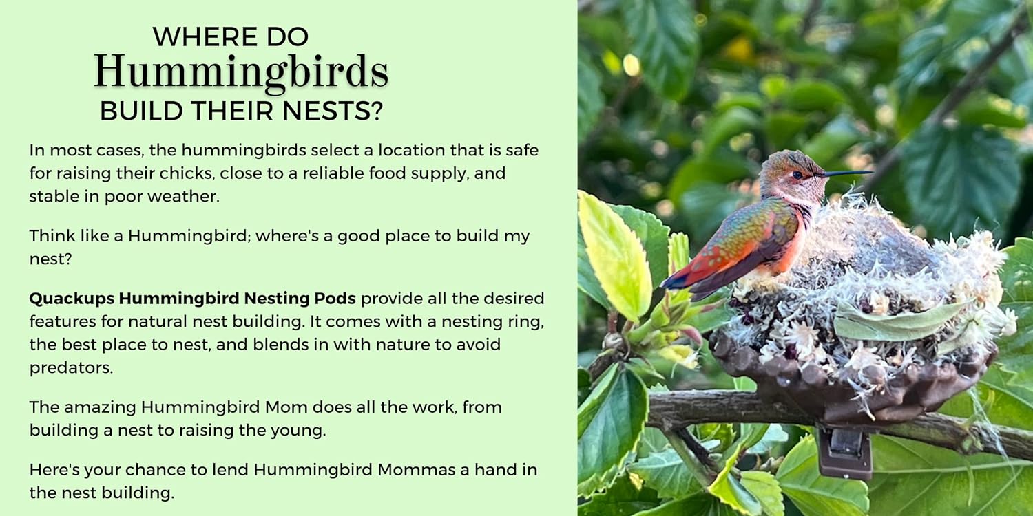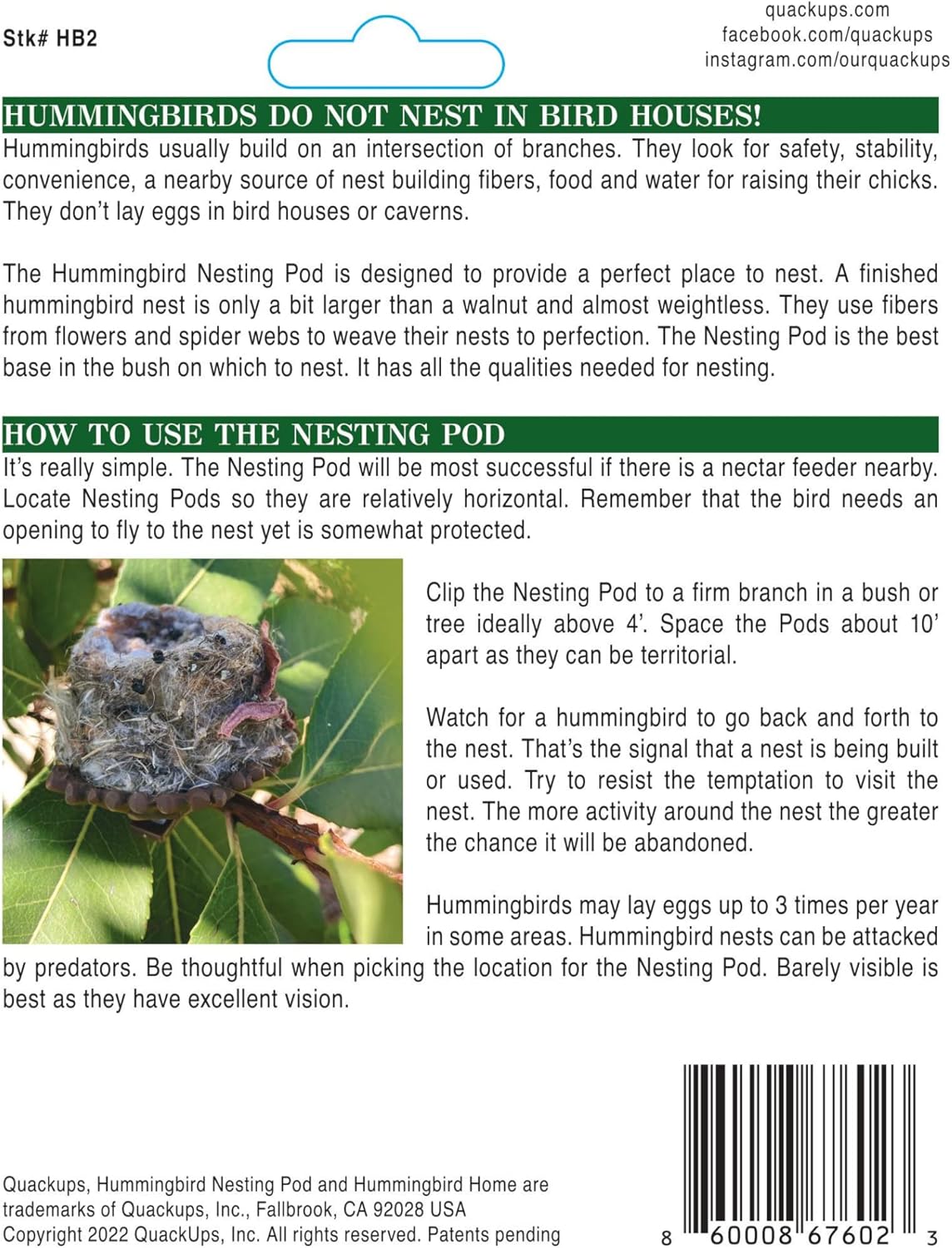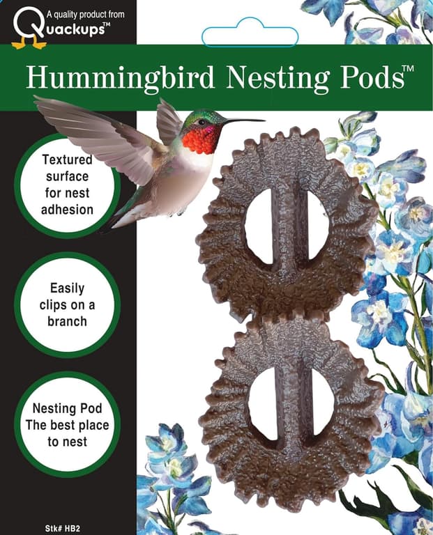 Hummingbirds do not build nests in bird houses. They usually build nests on intersections of branches.The Hummingbird Nesting Pods clip on a tree branch or shrub. It is designed to provide a perfect place to nest and raise chicks. Textured surface to help with nest adhesion. The Hummingbird Nesting Pods will be most successful if there is a nectar feeder in the vicinity. At Quackups, we are committed to helping Hummingbirds find a home and helping them thrive in nature.Specifications