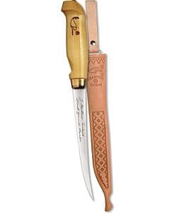 Made by Marttiini the makers of premium Rapala fillet knives for over 50 years.More guts than any other knife this is the one that taught the world to fillet. With over 40 million sold to date this knife is used in more fishing camps on more charter boats and by more fisherman than any other fillet knife in the world. Progressively tapered flexible full-tang blade of European stainless steel that takes and holds an ultra-sharp edge is securely anchored in legendary birch handle. All protected by a fine tooled leather Laplander sheath with safety-first free-swing belt loop that always keeps sheath and blade clear of the body. With four blade sizes to choose from theres one just right for every fish cleaning chore. Includes easy-to-use single-stage sharpener that keeps blade razor sharp.Classic Birch HandleProgressively tapered full-tang bladeSafety Notch secures tang to brass feruleFine tooled leather sheathIncludes single-stage sharpenerSpecifications