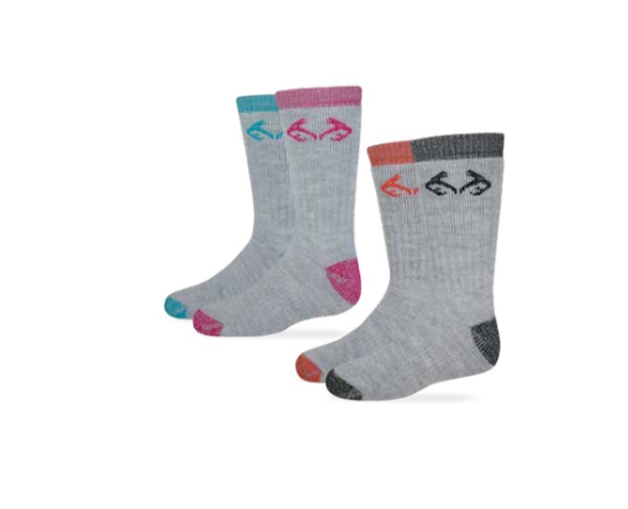 Realtree kids merino wool blend boot sock 2 pack, featuring full cushion leg and foot with reinforced heel and toe.Specifications