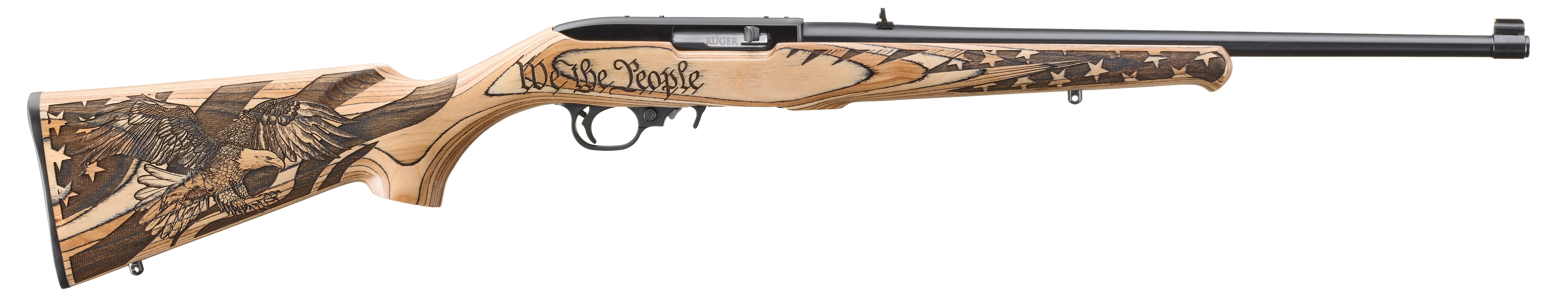 Celebrate American heritage with the Ruger 10/22 Carbine "We The People" Edition, a TALO Exclusive that blends legendary reliability with patriotic design. This semi-automatic rimfire rifle features a handsomely engraved Altamont natural laminate stock with a bold "We The People" motif, making it both a functional firearm and a collector's piece. Chambered in .22 LR, this carbine offers an ideal balance of performance and ease of use. Its 18.5" blued barrel and 1:16" twist rate ensure precision shooting, while the gold bead front sight and adjustable rear sight provide reliable target acquisition. Whether you’re plinking, training, or enjoying a day at the range, the 10-round rotary magazine keeps you shooting with minimal downtime. The Ruger 10/22 Carbine includes a drilled and tapped receiver and a scope base, offering flexibility for optics mounting. Weighing in at just 4.9 lbs., this rifle is light enough for young shooters or those who prefer a nimble platform.Specifications