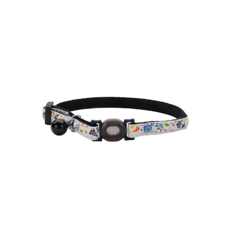 Never lose sight of your cat with the Safe Cat Glow in the Dark Adjustable Breakaway Collar.Whether your cat roams your home or the wild at night, this collar improves visibility in the dark with its glowing design. Its pivoting breakaway buckle releases the collar if your cat gets caught, allowing him or her to slip away easily. Plus, the adjustable 8-12" length ensures a secure, comfortable fit. The collar's pattern design adjusts to lighting, featuring bright colors during the day. Choose from a range of fun patterns!Specifications