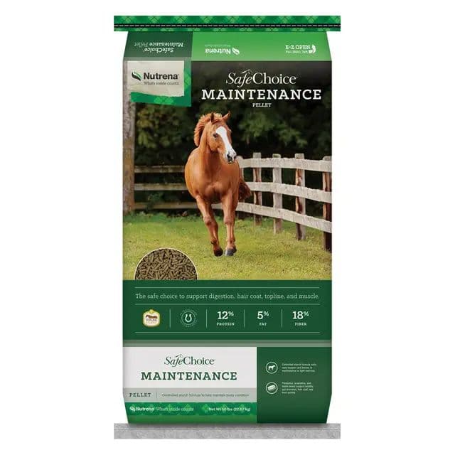 SafeChoice Maintenance Horse Feed provides support for horses whose energy levels are naturally beginning to slow down. It’s a proven, controlled-starch formula that supports healthy digestion at a moderate calorie level. The low starch formula helps maintain body condition, with guaranteed maximum levels of starch and sugar levels.Specifications