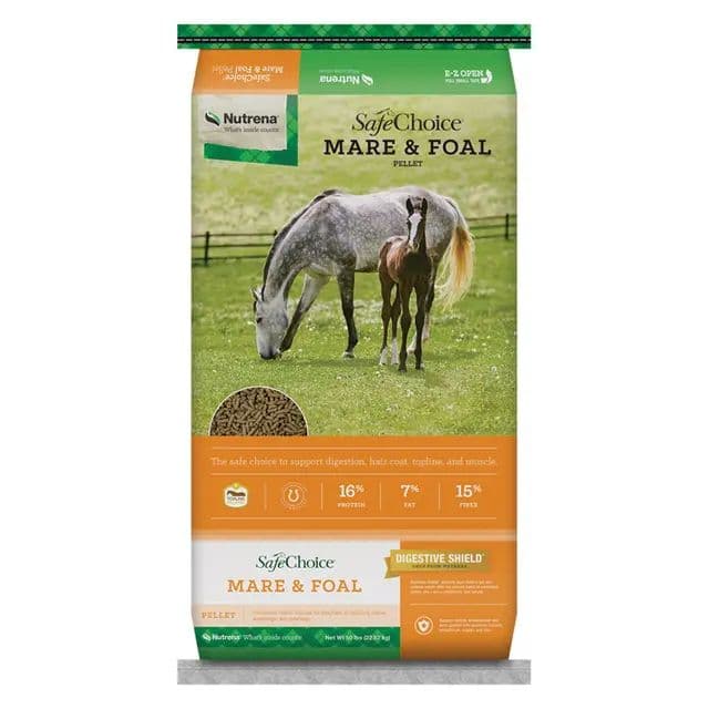 SafeChoice Mare & Foal Horse Feed is specially-developed controlled starch to help your newest additions begin healthy lifestyles, thanks to a balanced diet and good nutrition. It nourishes growing muscles, contributes to proper bone growth, supports a young immune system, enhances hair and hoof quality, and aids in nutrient digestion and health. It’s everything you need to be sure your foals get a head start in life. This controlled starch pelleted formula is perfect for pregnant or lactating mares, weanlings, and yearlings. The highly palatable formula encourages consumption to smooth the transition from weaning, and balanced calcium, phosphorus, copper, and zind help support healthy bone growth.Specifications
