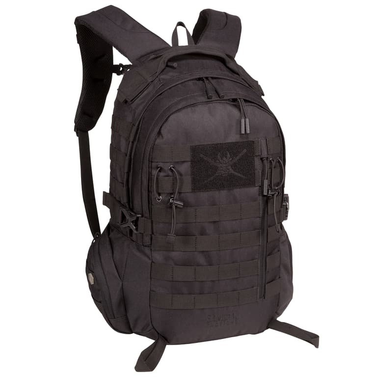 29L daypack hydration compatible (reservoir not included); dual hydration hose ports; front accessory pocket with organizer; molle webbing; padded mesh back panel; padded mesh shoulder straps; side compression straps; soft-lined sunglasses and electronic device pocket; Tactical Day Pack; trekking pole loops; velcro patch holder; zippered stash pocket