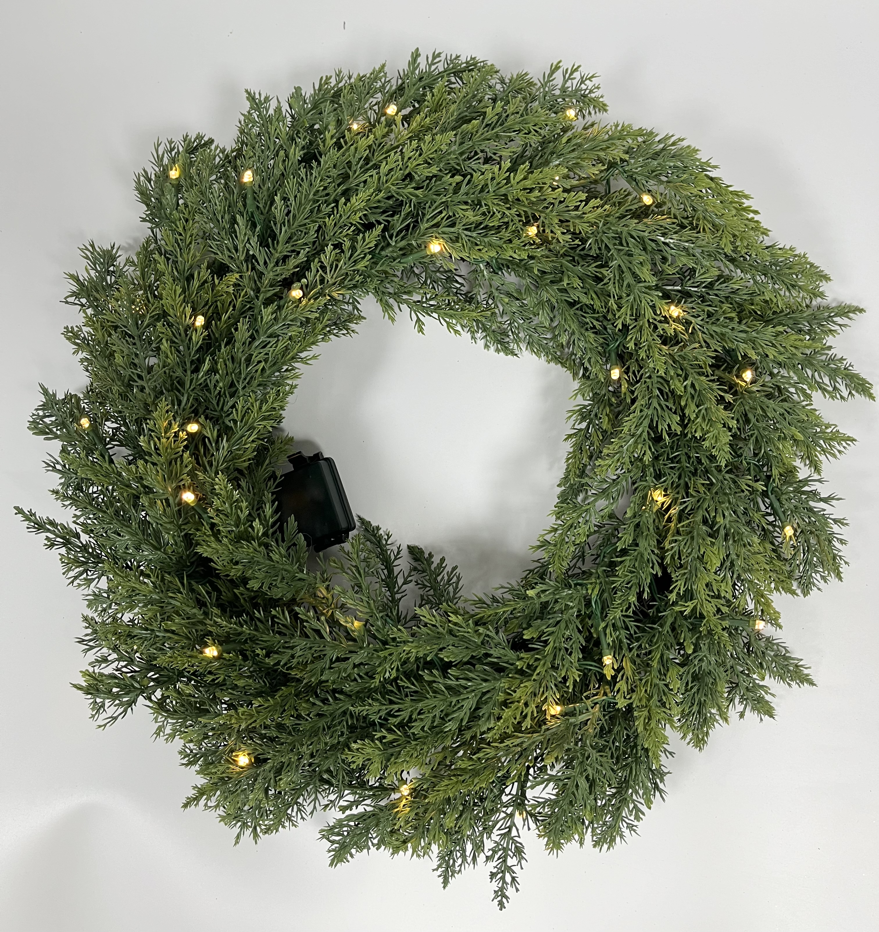 24" Wreath; 30 Lights 45 Tips; 9 Function; Battery Operated; Cedar