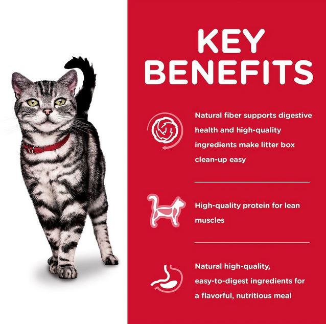 ANTIOXIDANT AND VITAMIN BLEND WORK TOGETHER TO HELP SUPPORT A HEALTHY IMMUNE SYSTEM; HIGH-QUALITY INGREDIENTS AND HEALTHY FIBER SUPPORTS DIGESTIVE HEALTH FOR A CLEANER LITTER BOX; MADE FROM NATURAL, HIGH-QUALITY INGREDIENTS WITHOUT ANY ARTIFICIAL COLORS, FLAVORS OR PRESERVATIVES; MADE IN THE USA, THIS IS A COMPLETE AND BALANCED DIET RECOMMENDED FOR ADULT CATS; NATURAL FIBER IS EASY TO DIGEST AND REDUCES OCCURRENCE OF HAIRBALLS