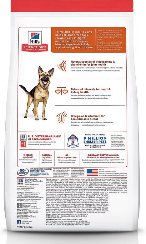 Hill's Science Diet Adult 6+ Large Breed Dry Dog Food provides your pup with precise nutrition for a healthy lifestyle. Made with wholesome ingredients such as savory chicken meal, rice and barley, this nourishing recipe is balanced to meet your pet’s needs and support joints and cartilage. Manufactured in the United States, every ingredient meets strict requirements for purity and nutrient content which exceed industry standards. Formulated for large breed dogs weighing 55 to 110 lbs and giant breed dogs that weight 110 lbs and over, this Hill’s Science Diet provides your pooch with the nutrition he needs for a lifetime of health and happiness.Specifications