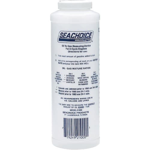 This plastic quart size bottle allows for the addition of the exact amount of oil required for mixing in a 2-cycle engine. Oil level marks are in gallons and liters. Seachoice is committed to delivering quality marine accessories and Oem replacement parts to satisfy fishing, boating and watersports enthusiasts worldwide. Seachoice is run for and by boaters offering a wide-ranging product line while remaining affordable.Specifications