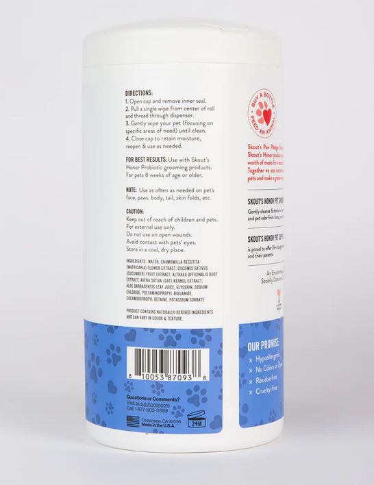 Gently cleanse, freshen & deodorize. Removes dirt, dander and pet odor from faces, paws, skin folds & bums! Hypoallergenic. No colors or dyes. Residue free. Cruelty-free Made with plant-based, biodegradable fibers. Contains 80 wipes.Specifications