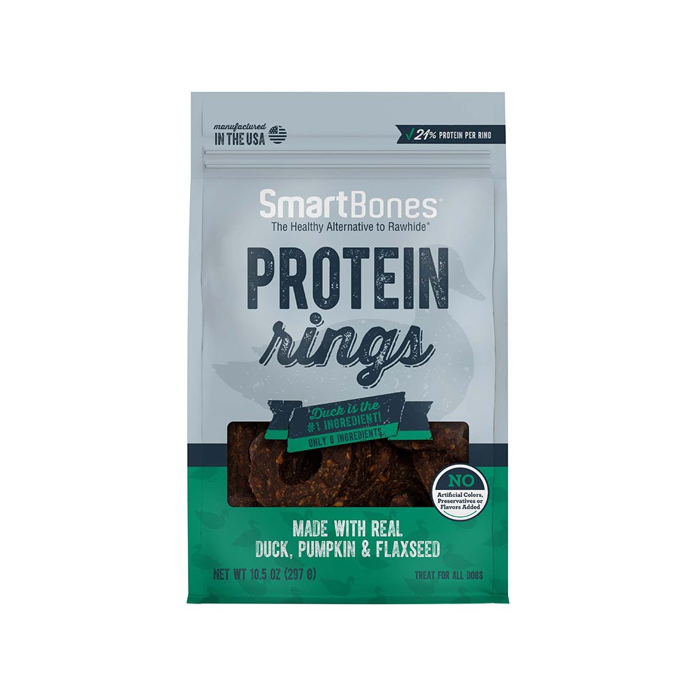 Scrumptious SmartBones Protein Rings Made with Real Duck, Pumpkin & Flaxseed are the perfect reward or in-between snack to keep your dog happy and satisfied. Not only are these treats delicious, but with 21% protein in each ring, you can also feel good about giving these wHOLE-some, 6-ingredient treats to your pup. Duck is the #1 ingredient and they’re made with no artificial colors, flavors or preservatives; no added wheat, soy or corn; and no added chicken. Plus, they’re manufactured and sourced in the USA.Specifications