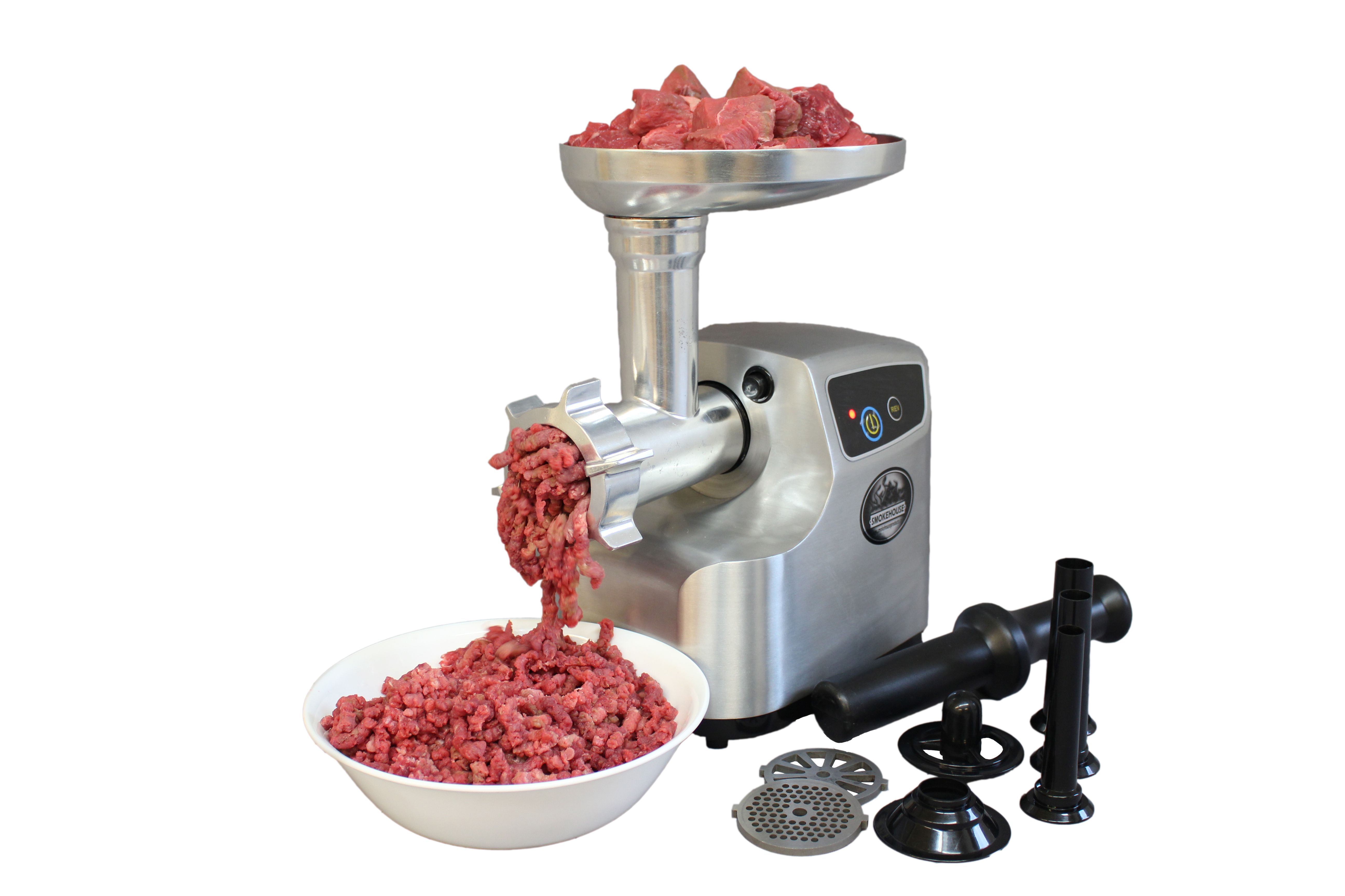 The grinder comes with a stainless steel cutting blade, all metal gears and gear shaft, and an all-aluminum case and grinder mechanism. It’s simple to use and easy to maintain. Simple push button controls for on/off/reverse. Grinder comes complete with fine and coarse grinding plates, as well as a sausage stuffer plate which works in tandem with included sausage stuffer tubes. This grinder is compact and light enough to store in your kitchen with a superior all metal exterior that is easy to clean. Perfect for daily kitchen cooking, powerful enough for the serious outdoorsmen.Specifications