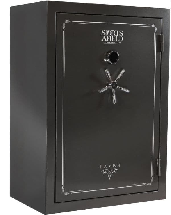The Haven Series of gun safes features industry best values in gun and possession protection. 75 minutes @ 1400 Degree fire protection along with 7 day Waterproof (up to 2' depth) provides the user with great protection during a fire or flood. 48 long guns and 8 handgun storage capability along with a Premiu/Deluxe door organizer for added storage. The Electronic E-Lock with Illuminated keypad and Printguard features ease of entry and protection against unwanted entry. Back-up key included for emergecny use. Features factory installed motion lighting so when safe opens, you will have light. Additionally, 2 plug ins for electrical needs and 2 USB Ports inside for charging while storing. Attractive 5 spoke chrome handle along with Gray metallic paint makes this a premium addiiton to any room or garage. Comes with the CA DOG seal of approval for secure firearm storage and Sports Afield Industry best warranty for the life of the product.Specifications