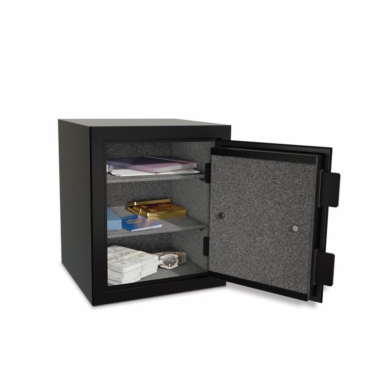 CA DOG Approved; Carpeted interior, 5mm steel and active backplates; Home & Office safe; Industry best Lifetime Warranty; Integrated keypad/handle with Illuminated buttons and back-up keys; Matte Black powder coated finish; Smoke and fire resistant 45 minutes @ 1800 degrees