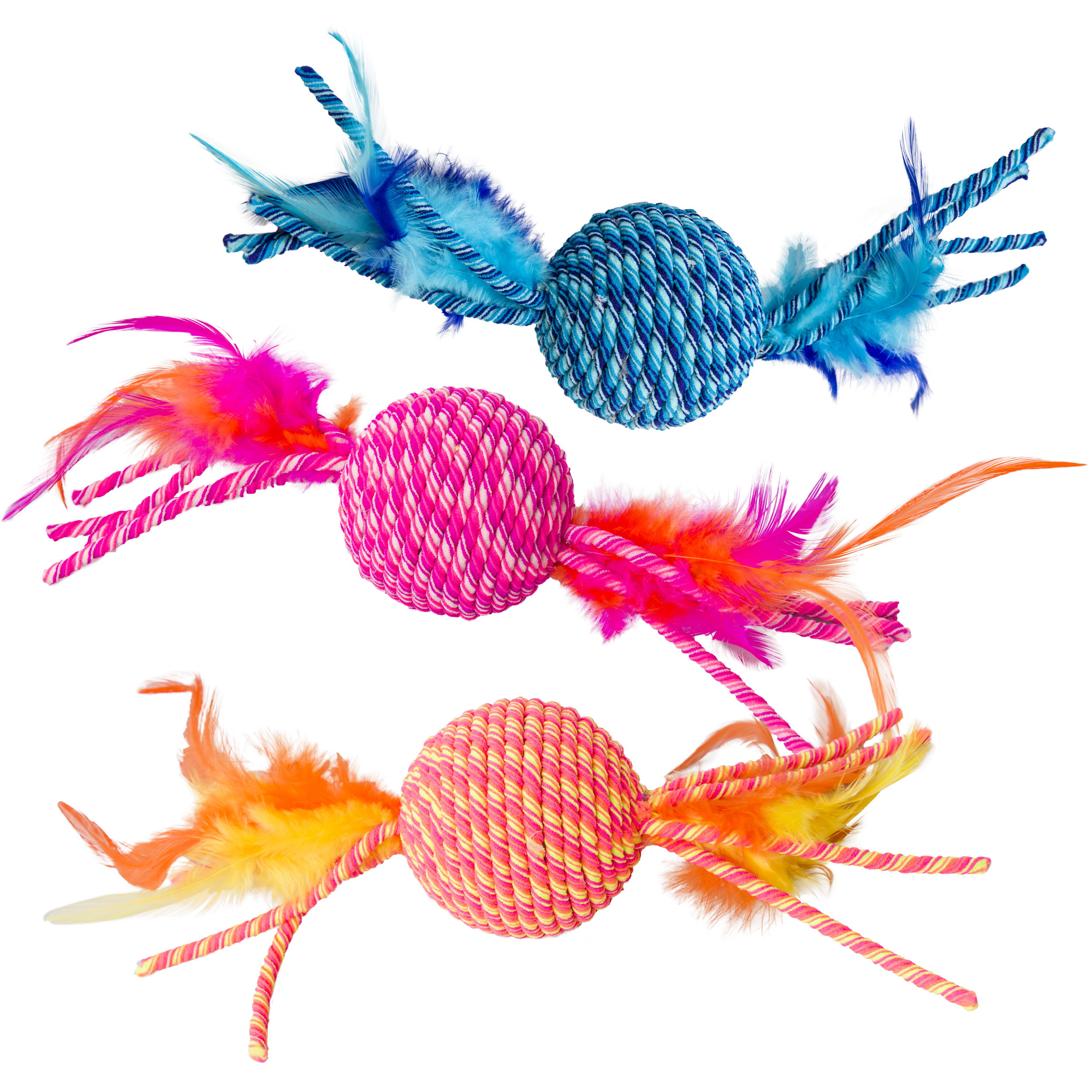 BRIGHTLY COLORED STRETCHY ROPE; IRRESISTABLE FEATHERS; PERFECT FOR BITING POUNCING BATTING AND SWINGING; STRETCHY TENDRILS