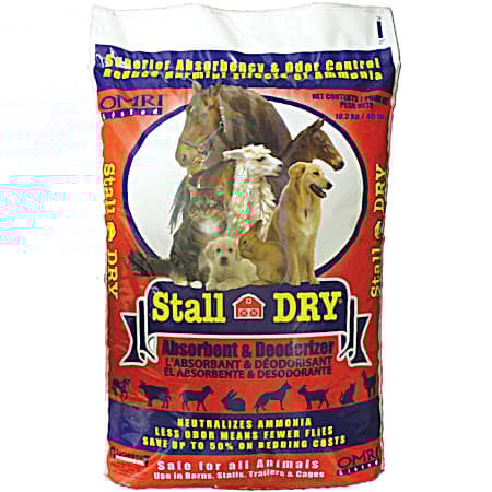 Stall Dry Absorbent and Deodorizer provides a safe and effective way to control moisture and ammonia to maintain a dry and healthy habitat for your animals. This granular formula consists of a natural mixture of Diatomaceous Earth and Calcium Montmorillonite, which absorbs and neutralizes pH levels, helping to eliminate unpleasant odors. It deodorizes and extends the life of bedding, creating a cleaner and safer environment. It features a minty-wood scent, leaving the cage, stall, barn, kennel, or trailer smelling good. It is non-toxic and non-caustic, so is safe to use on wood, metal, concrete, and rubber surfaces. It is also OMRI Certified, making it safe for organic production. With regular use, it may help reduce labor and bedding costs by up to 50%. Ideal for all types of small and large animals.Specifications
