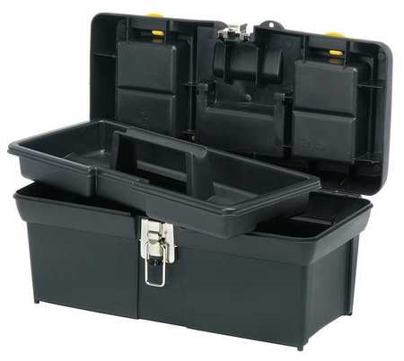 The Stanley 016013R 16 Series 2000 Tool Box with Tray features two lid organizers for small parts storage accessible without opening the tool box. It has a built-in pad lock eye for small locks keeps contents secure. It also has a tote tray inside to store smaller items. The soft wide rubber coated handle allows for easy & comfortable grip. Nickel metal-plated latches.Specifications