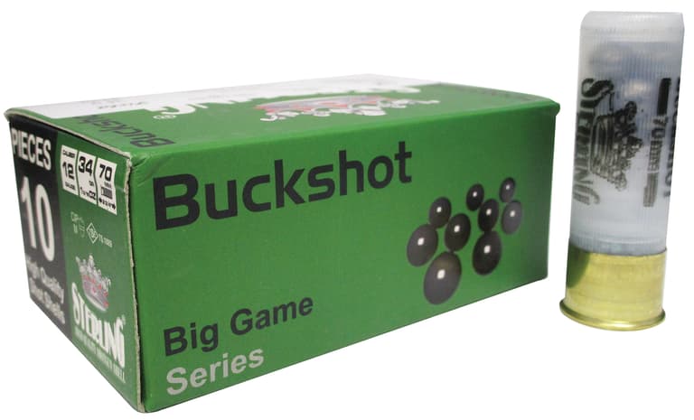 Sterling 12 ga Buckshot shotgun shell that is filled by specially produced gunpowder for buckshot is very effective in big games in short distances with its perfect dispersing. It is possible to see the completely round shining buckshots through its high quality crystal upper wad. Besides, with its long metal case head it is resistant to high pressure under any conditionSpecifications