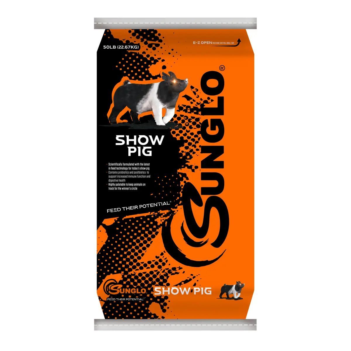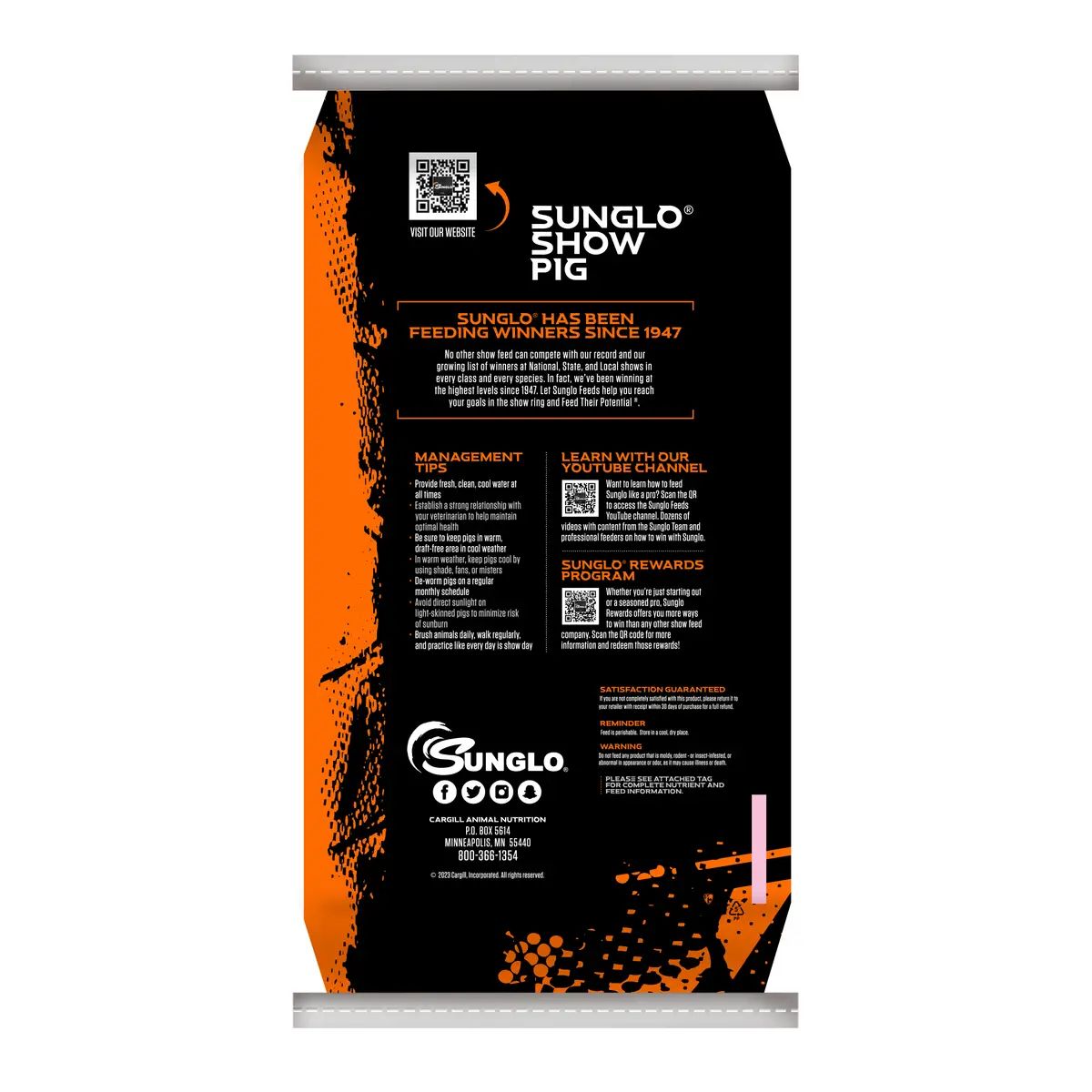 Sunglo Show Pig Complete pellet is a premium show pig feed that is scientifically formulated with the latest in feed technology to help maximize your pig's genetic potential. Let Sunglo Feeds help you reach your goals in the show ring and Feed Their Potential.Specifications