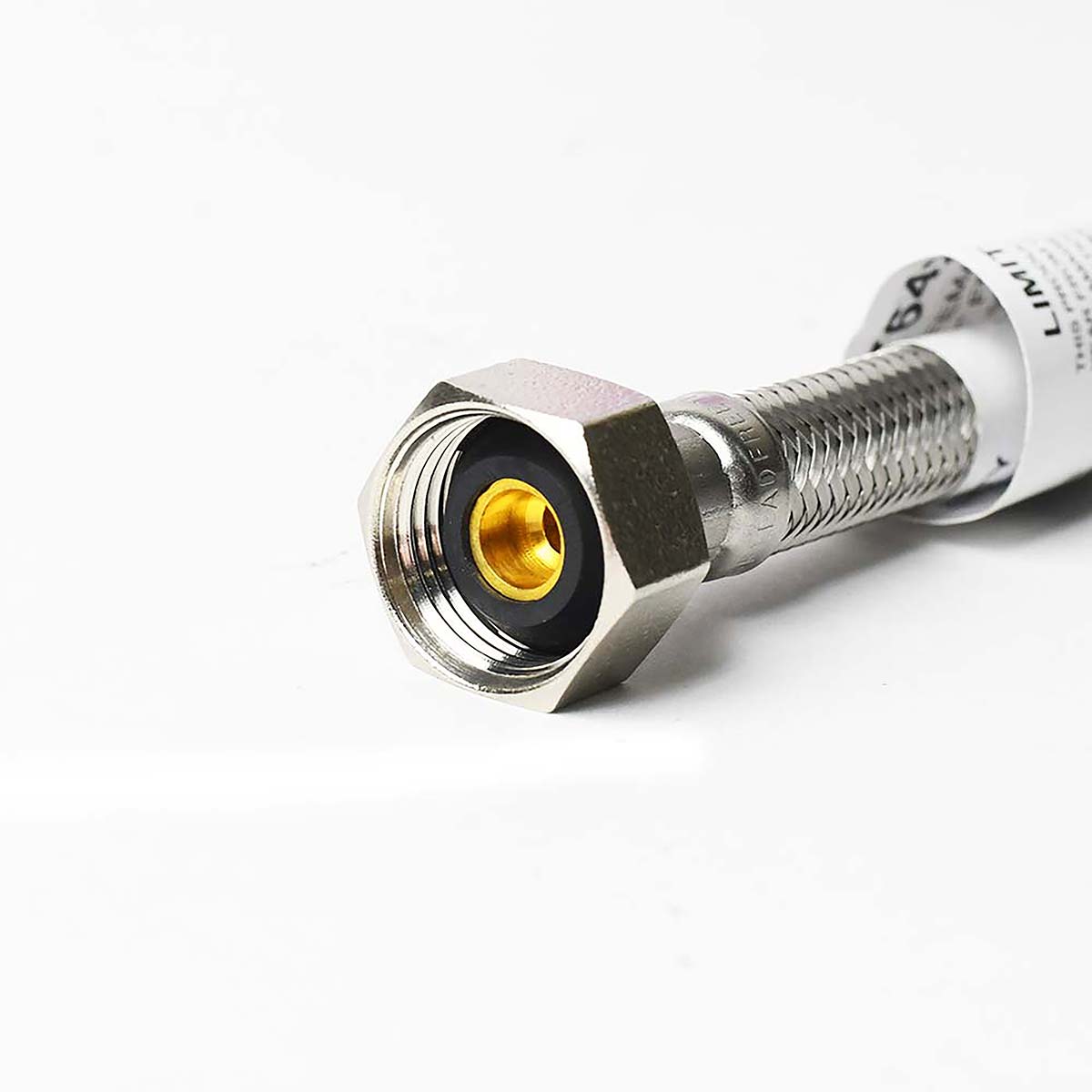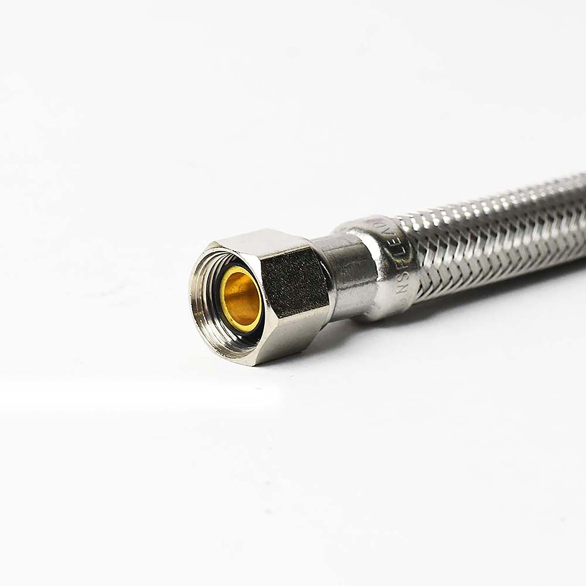 304 stainless steel braiding with reinforced PVC; Allows easy bendability without crimping; Easy to install with a combination of FIP and Comp connectors; Features nickel-coated brass hex nuts and full flow barbs; Premium quality build for corrosion resistance and lasting durability