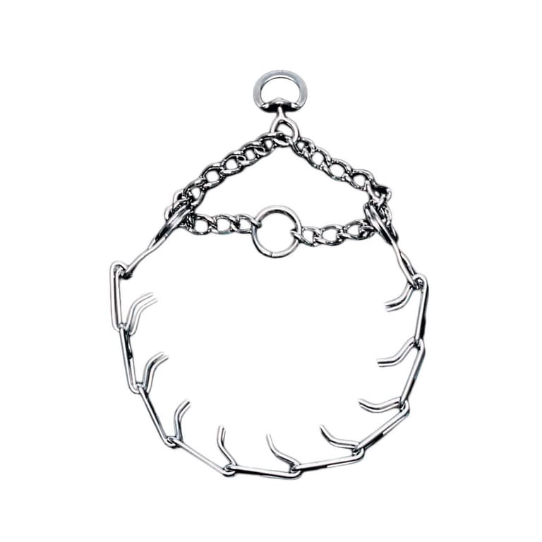 Blunt prongs do not cause pain or harm. Replacement links available to increase collar size.; Chrome prong training collar is safe, practical and easy to use for effective training.; Great for walking strong pullers, large dogs, obedience training and behavior correction.; Symmetrical prong placement provides natural contact for optimal communication.